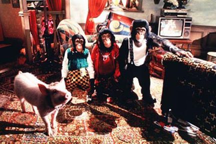 Babe, meanwhile, hangs out with the chimps, the orang, and a variety of dogs. They all hate Babe and want him to go away. And so okay, enough with the plot. In short, more insane antics ensue, Babe works wonders, saves the day, and earns the admiration of all those who doubted him. There’s an outrageous finale at a fancy dinner, a series of rapid flashbacks reminiscent of Midnight Cowboy, and somewhere in the middle a shot of a dog in a wheelchair biting on to the underside of a speeding truck, a shot that might as well have been an outtake from The Road Warrior.