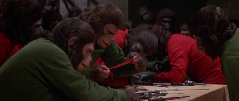 Caesar sneaks into a cage of newly imported orangutans from Borneo and finds himself entered into the ape-conditioning factory, where apes learn to make beds, pour glasses of water, dance around to horrific future disco music, and not shy away from flamethrowers. This sequence is, as I hope you are imagining, completely bonkers. Caesar, secret smarty-pants that he is, doesn’t need a bit of conditioning. He can pour a glass of water just like a human. He’s that good.