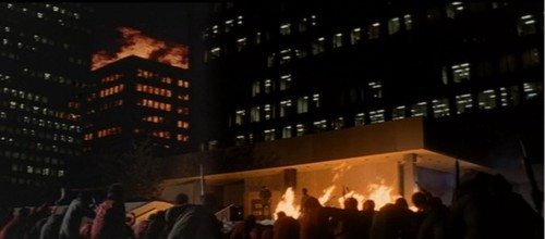 Best part of the movie, right there. The tension is high. What will the apes do? Turns out in the original version of the movie played for preview audiences (and now available on blu-ray), the apes beat Breck to death while the city burns behind them, Caesar watching over the destruction he has wrought.