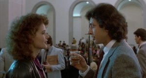 It begins at some kind of cocktail party for scientists. Seth tells Veronica he’s working on a project that will change the world and invites her to his place to see it. She declines, walks away, he runs up to her, says no, seriously, I’m changing the world, come with me. She says yes. This takes maybe two minutes. And hey presto, they’re at his loft and he’s teleporting her stocking. I love a movie that doesn’t mess around with needless backstory. So many extras hired for this scene! And for two minutes of screen time.