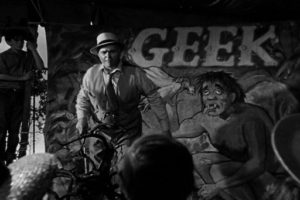 Nightmare Alley was the first book to popularize the term “geek” for the carny act of a wild man biting the heads off chickens and snakes. Gresham had met a man, an ex-carny, who told him many tales of life on the road, but it was the geek, and how he was made, not found, that stuck with Gresham, that drove the writing of the book. In both book and movie, it’s explained simply. Find a drunk, ask him to wear a costume and “play” the geek until they find a “real” one. Give him a bottle of liquor a day and a place to sleep, have him use a razor blade to cut the chicken’s neck, pretend to drink its blood. A week later tell him faking it’s no good, they’ll have to get a real geek. Envisioning the horrors of the DTs without his daily bottle, the fake geek becomes the real one. As an alcoholic himself, this terrified Gresham.